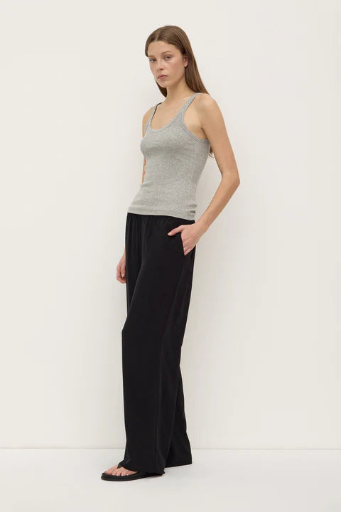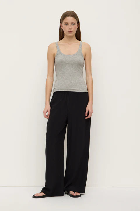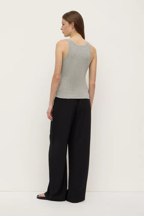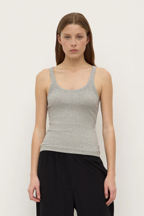 The Charlie Rib Tank in grey marle is a soft cotton jersey top with a scoop neckline and ribbed stretch finish.