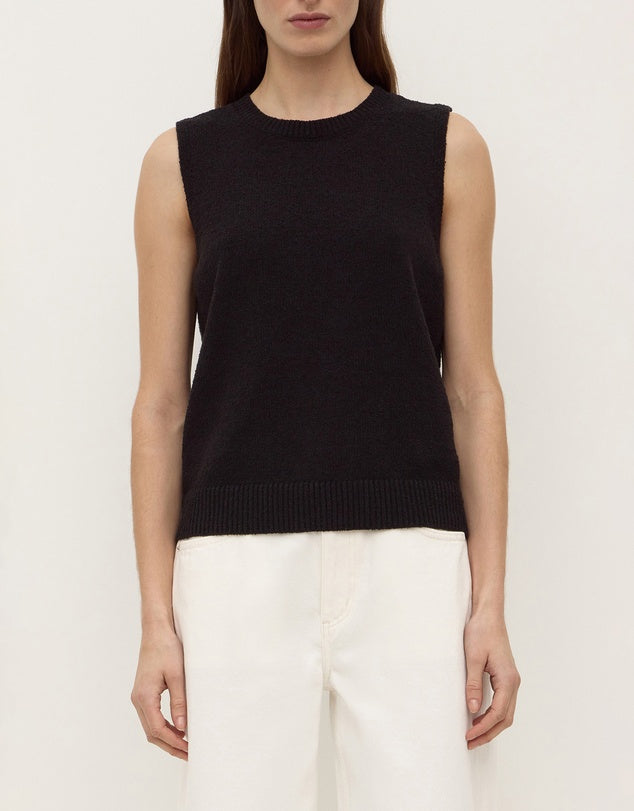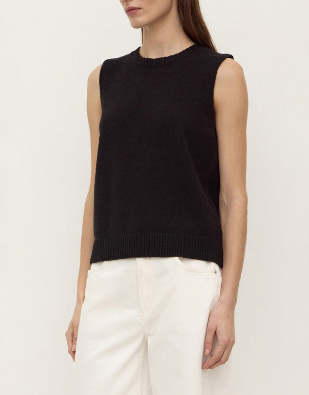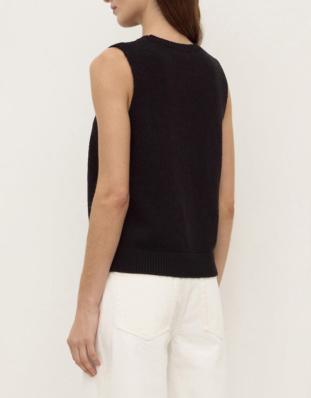 The Palma Knit Vest in black is a 100% cotton vest with ribbed crew neckline, armholes and hem.