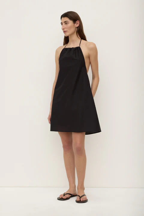 The Addison Halter Mini Dress in black is a cotton silk blend mini dress with an adjustable tie halter and open back.