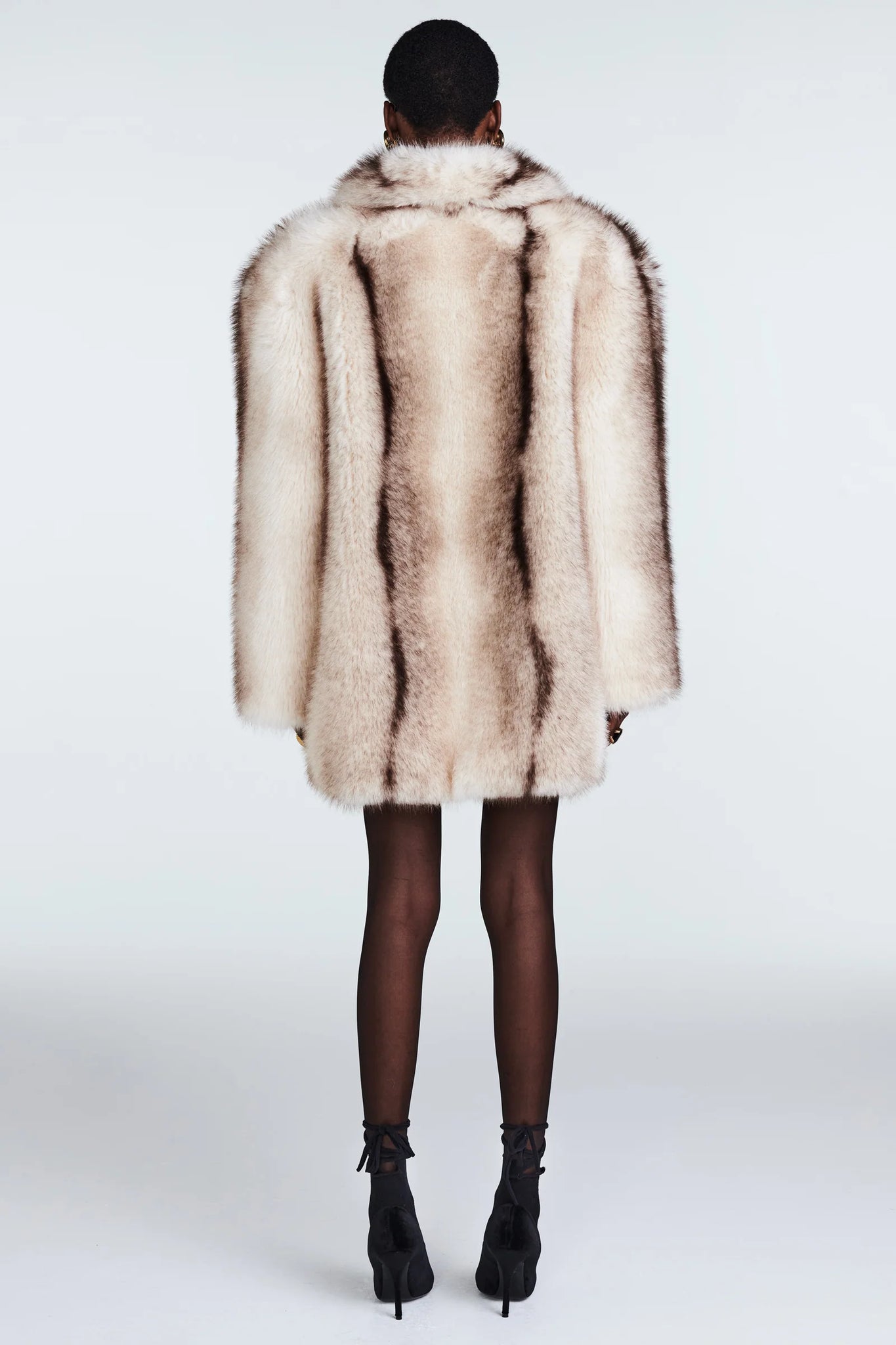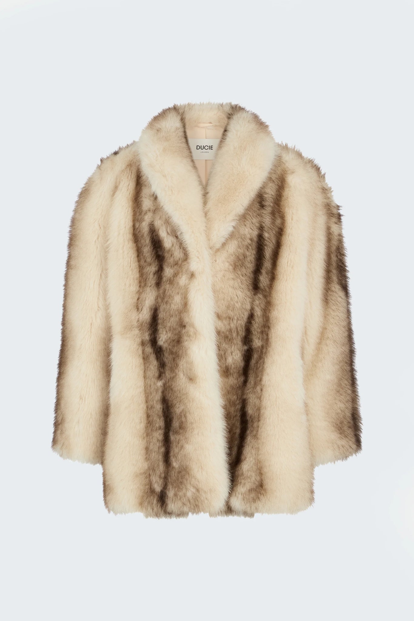 The Emilia jacket stands out with its luxurious faux fur and eye-catching print, making it a true statement piece in any wardrobe. This jacket is designed at hip length and features a sophisticated shawl.
