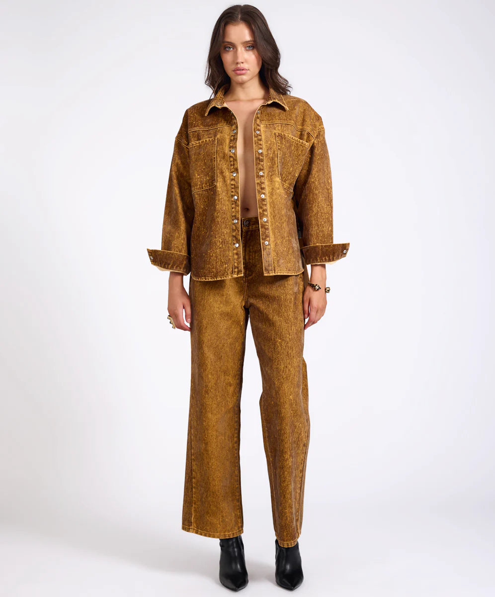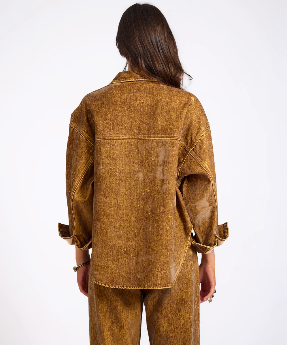 The TOBACCO DARIA FLOCKED DENIM SHACKET blends rugged denim attitude with a plush velvet-touch finish. A structured yet soft layering piece that brings unexpected texture to classic denim.