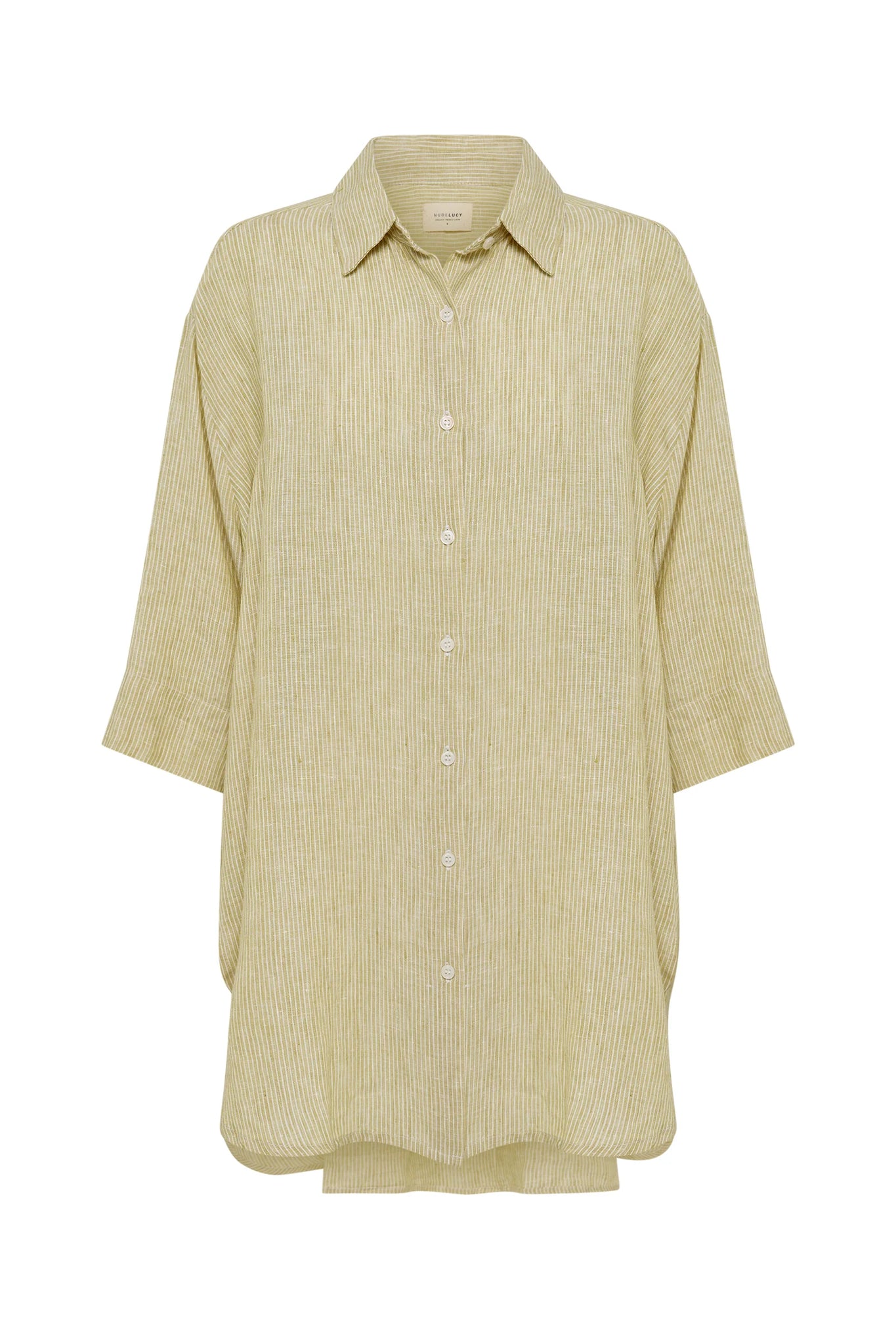 The Lounge Stripe Linen Long Shirt is made in a premium 100% organic French linen which has been washed down for a soft and breathable hand feel and features an exclusive yarn dyed stripe. The silhouette is relaxed and oversized with a long billowing hemline and side slits. Features include classic shirt detailing with collared neckline, button front opening, 3/4 sleeves and a Nude Lucy branded label. This Longline Shirt can be worn by itself or paired with a Nude Lounge bottom.