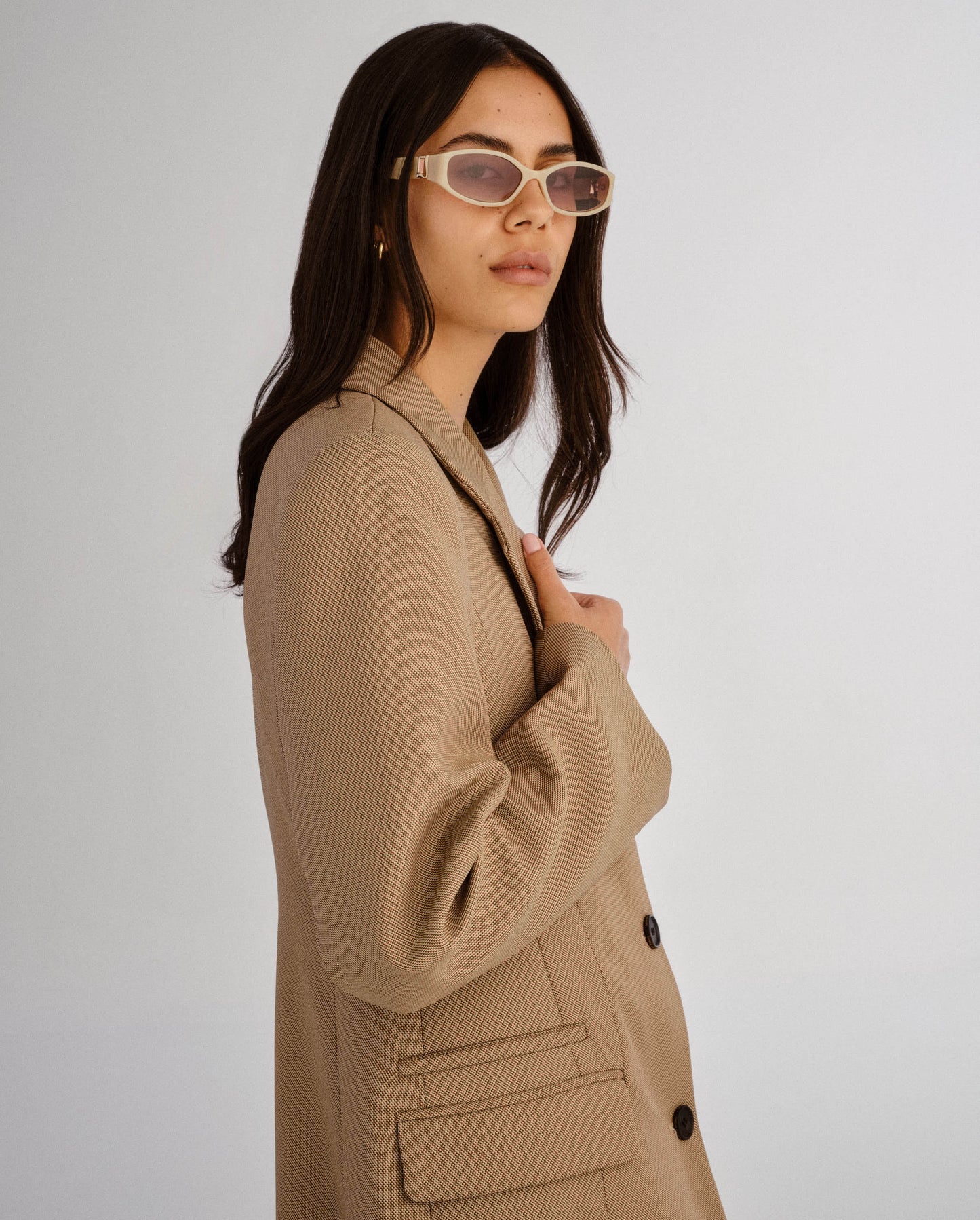 A refined take on a modern staple. This luxe rectangle frame features sculpted angles and polished gold hardware detailing at the temples. Understated yet striking, these sunglasses are designed for the girl with effortless style and a sharp eye for detail. Clean lines, timeless shape - made to go with everything.