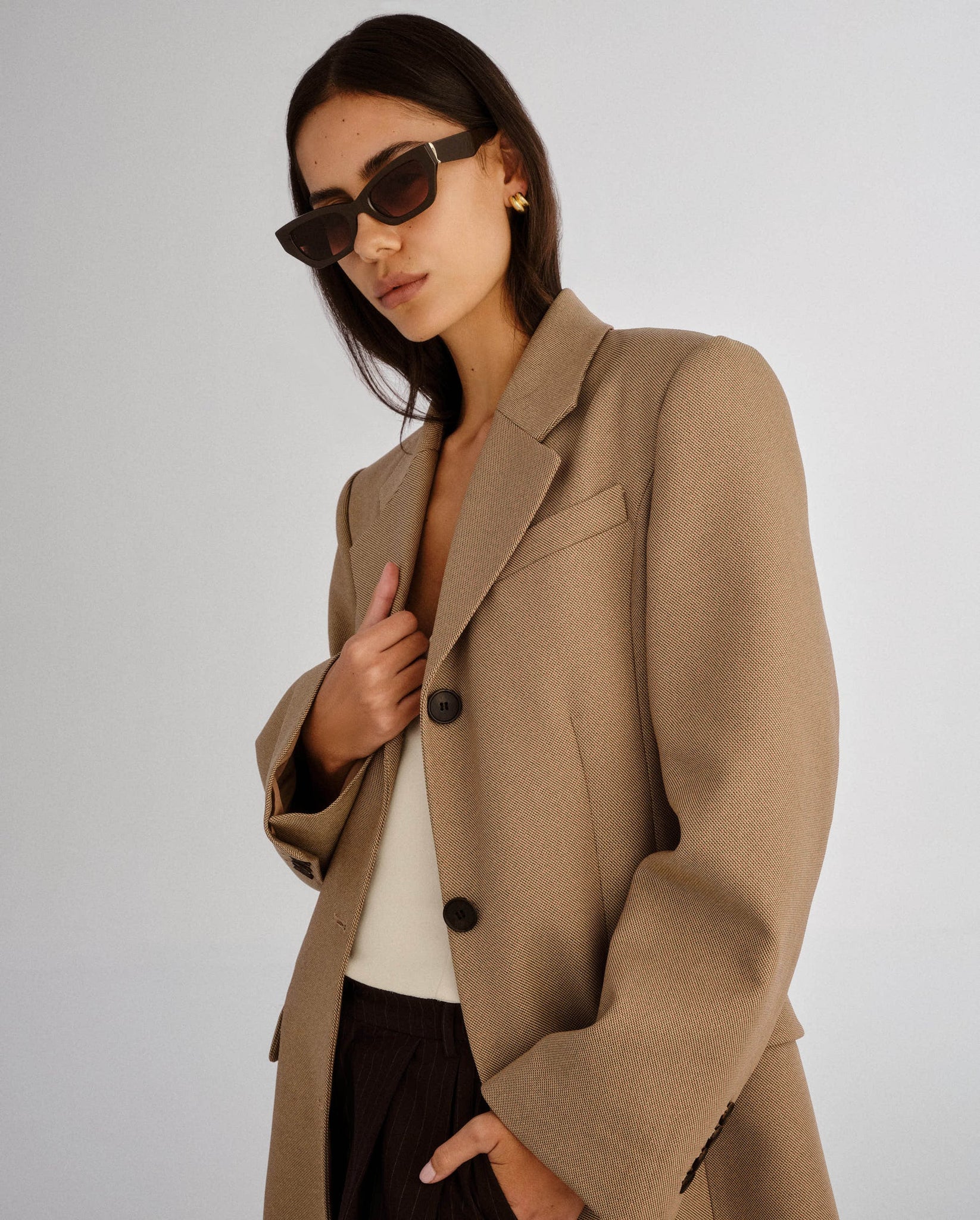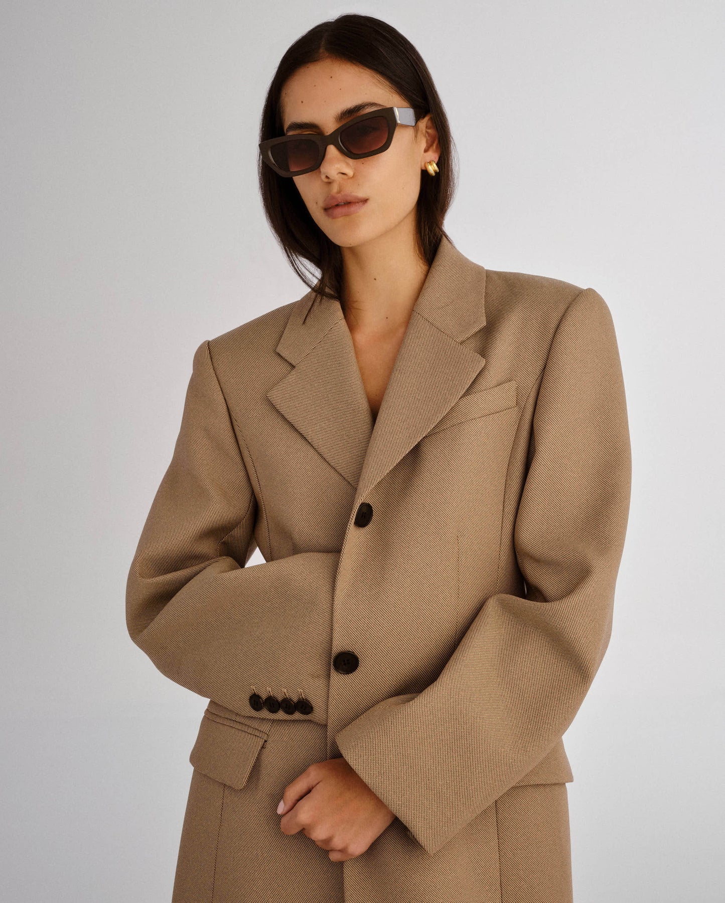 Bold in all the right ways. The Sutton is a wide cat-eye frame with sharp lines and thick temples, balanced by subtly curved metal detailing that adds a refined touch. Designed to frame the face with confidence, this style is equal parts statement and staple.