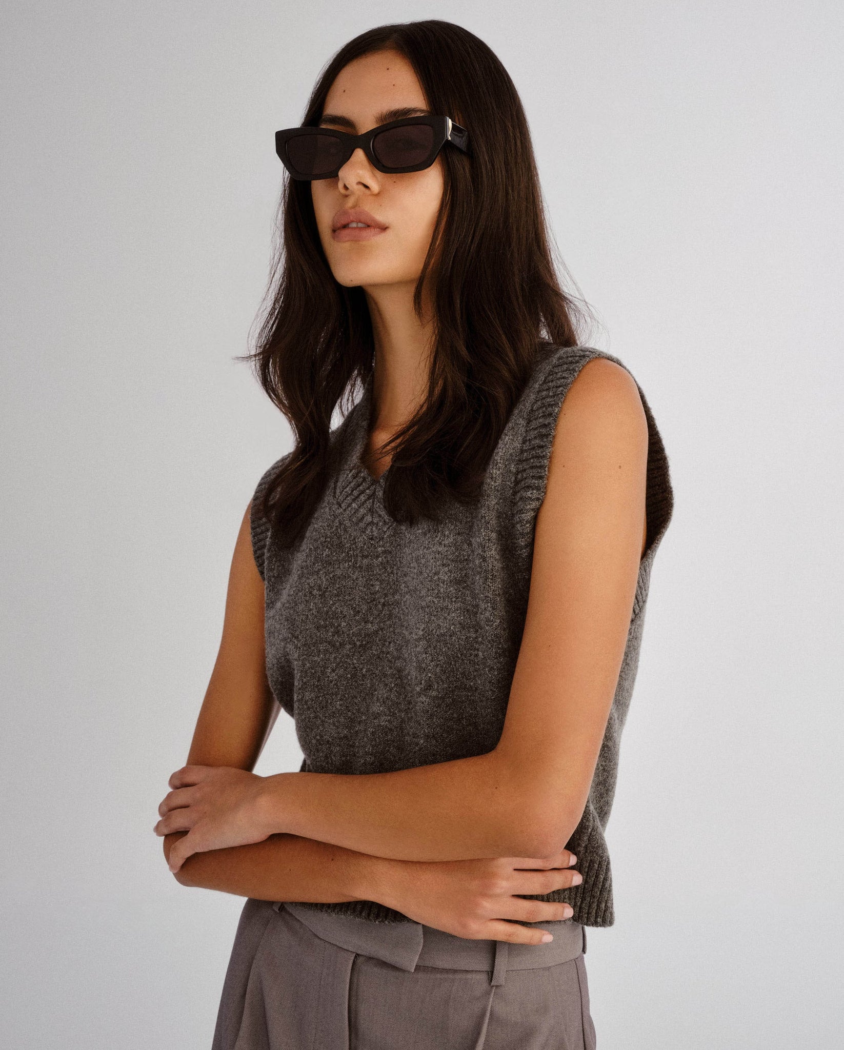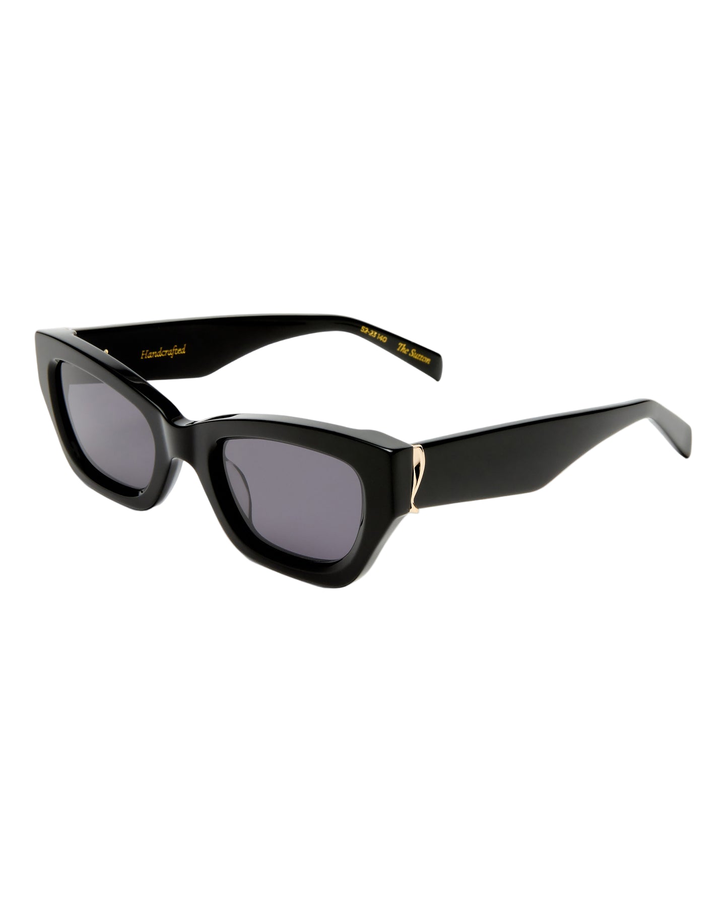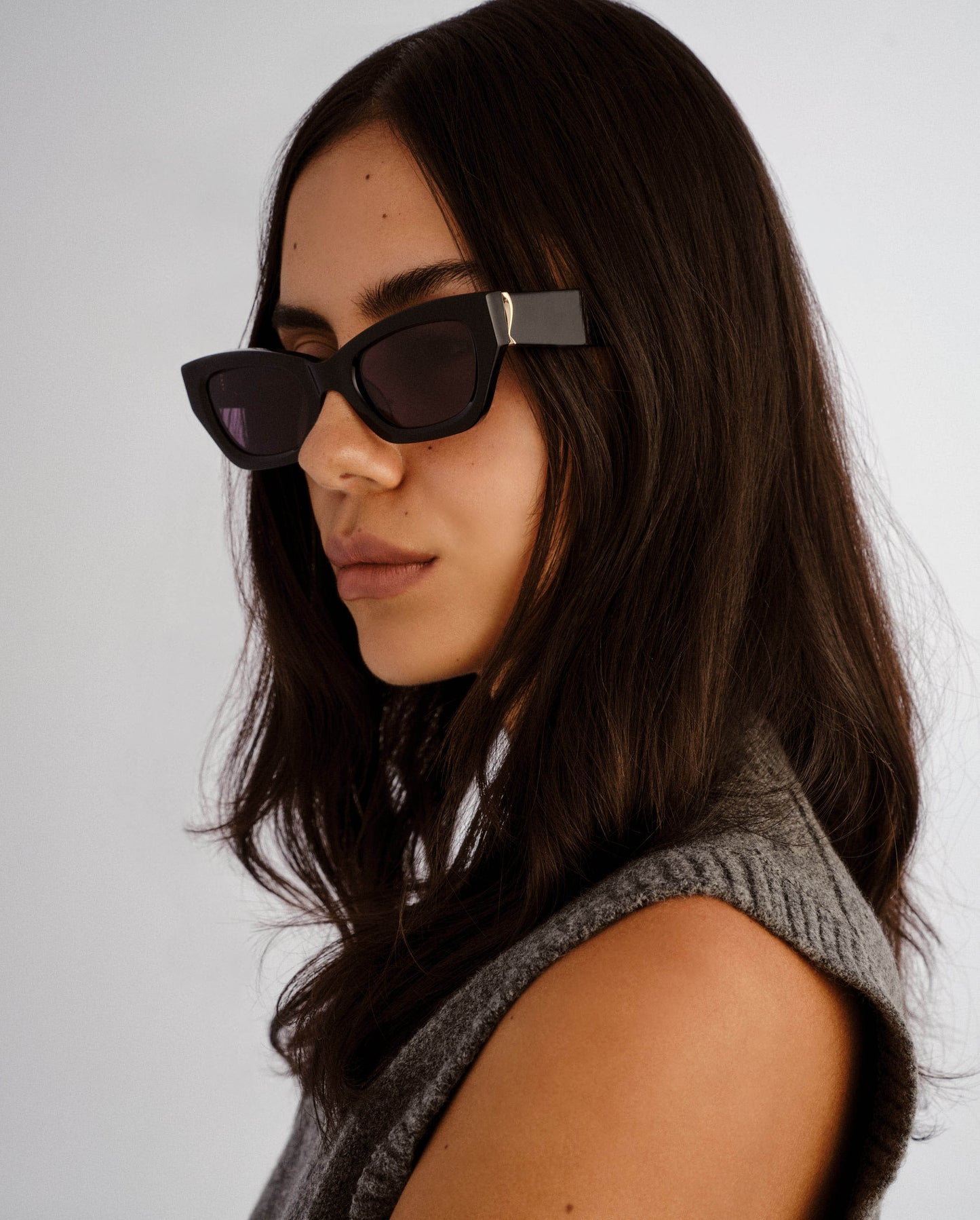 Bold in all the right ways. The Sutton is a wide cat-eye frame with sharp lines and thick temples, balanced by subtly curved metal detailing that adds a refined touch. Designed to frame the face with confidence, this style is equal parts statement and staple.