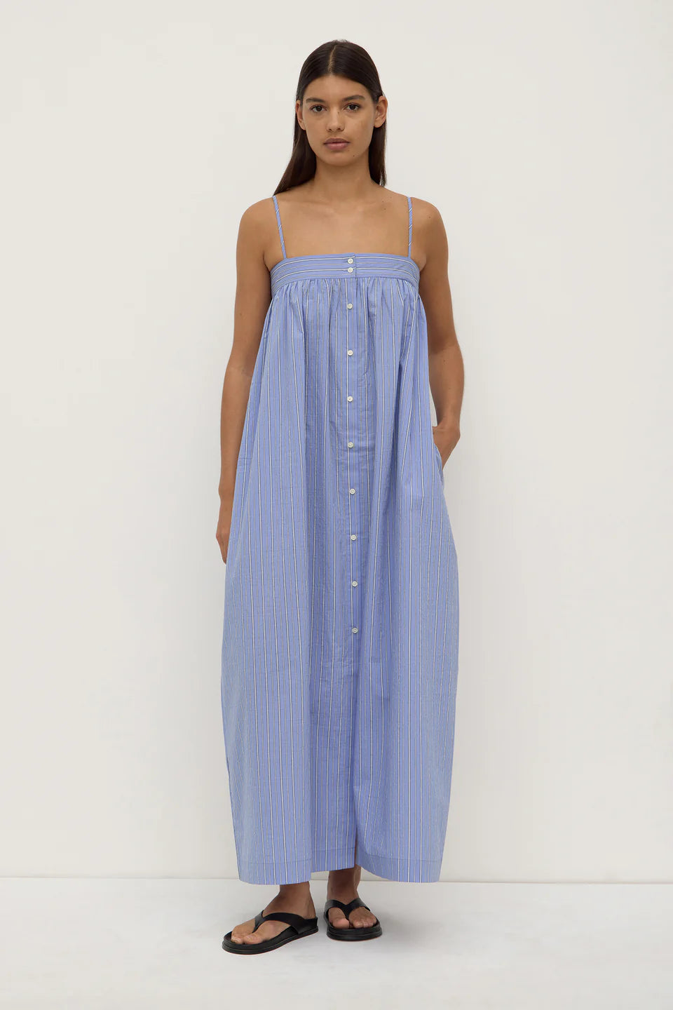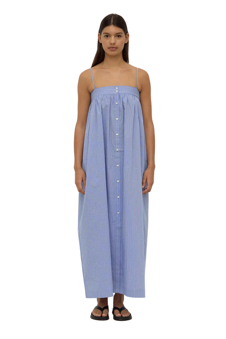 The Erina Stripe Maxi Dress in blue/white stripe features a button-down front, adjustable straps, and is crafted from 100% cotton poplin.