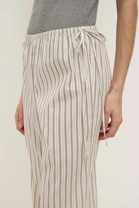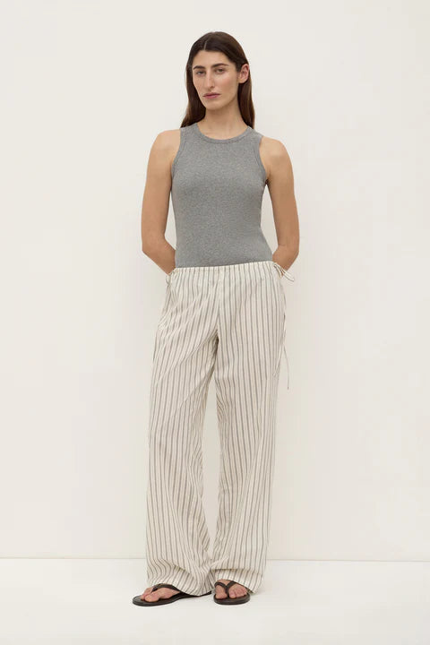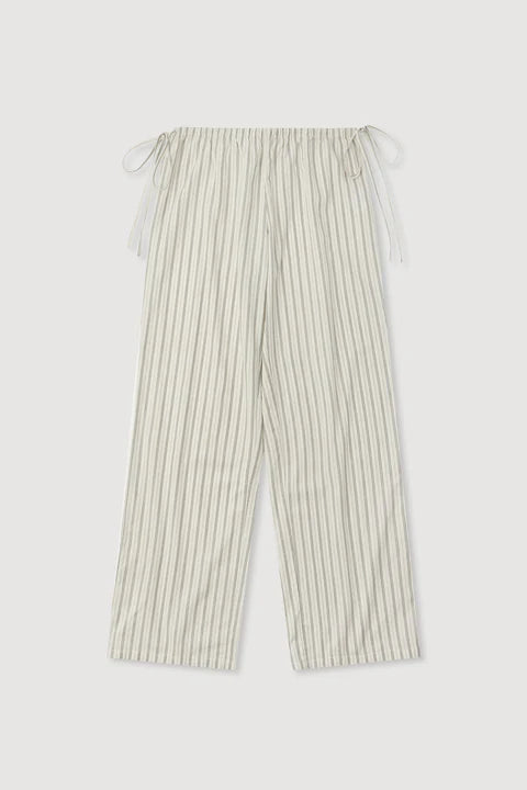 The Ria Stripe Pant in Cream/Smoke is a low-rise, straight-leg pant with an elasticated waistband and side waist ties.