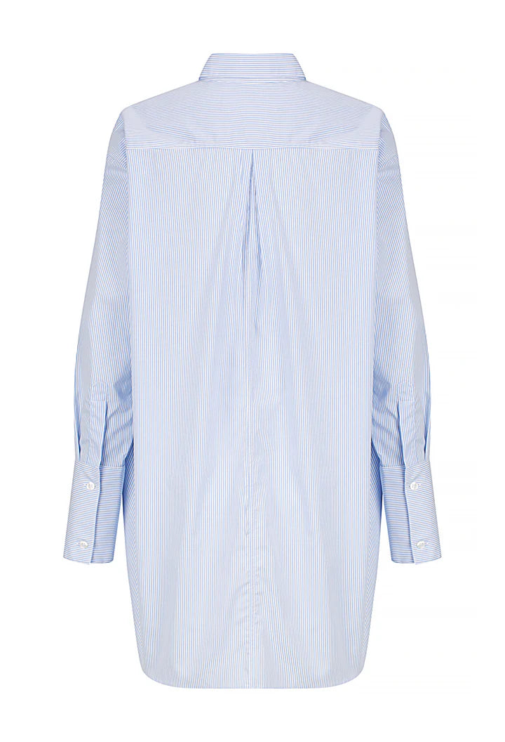 The stripe boyfriend shirt features an oversized fit with front pocket and back pleat details. Traditional shirt detailing, including collar, back yoke, button through front placket, and sleeve cuffs. Hem has a stepped, scooped shape with fine hem finish. This shirt is your got to for relaxed and casual look all year round.