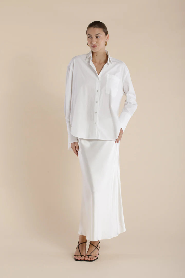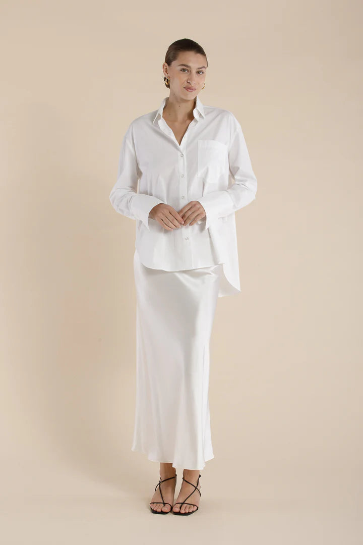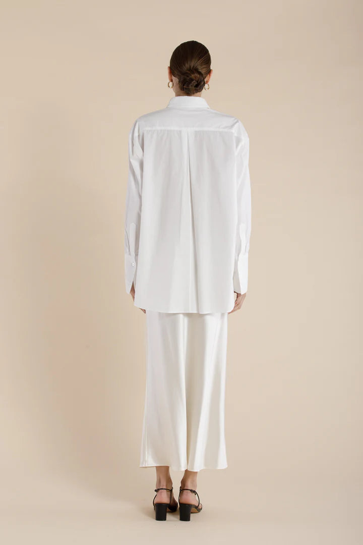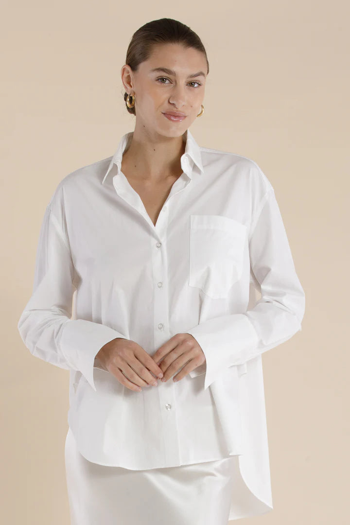 Defined as relaxed precision, The Ida Shirt is a long sleeve essential crafted in a classic SELFE silhouette — tailored with intention, worn with ease. Featuring a relaxed fit with a single front pocket, back pleat detail, and traditional shirting elements: structured collar, back yoke, and button-through placket. The stepped, scooped hemline and fine finishing lend a refined touch. Designed for effortless wear from daily rituals to evening moments, across all seasons.