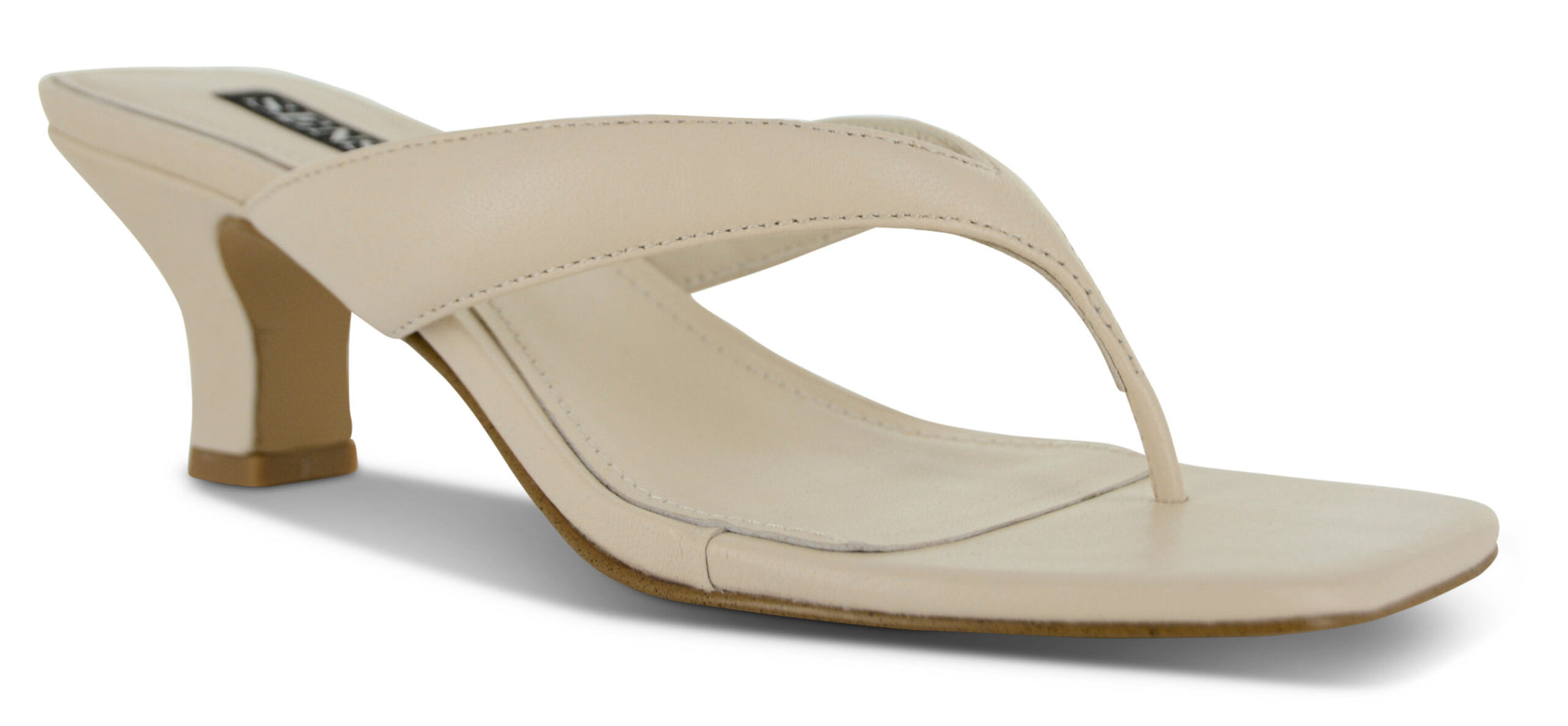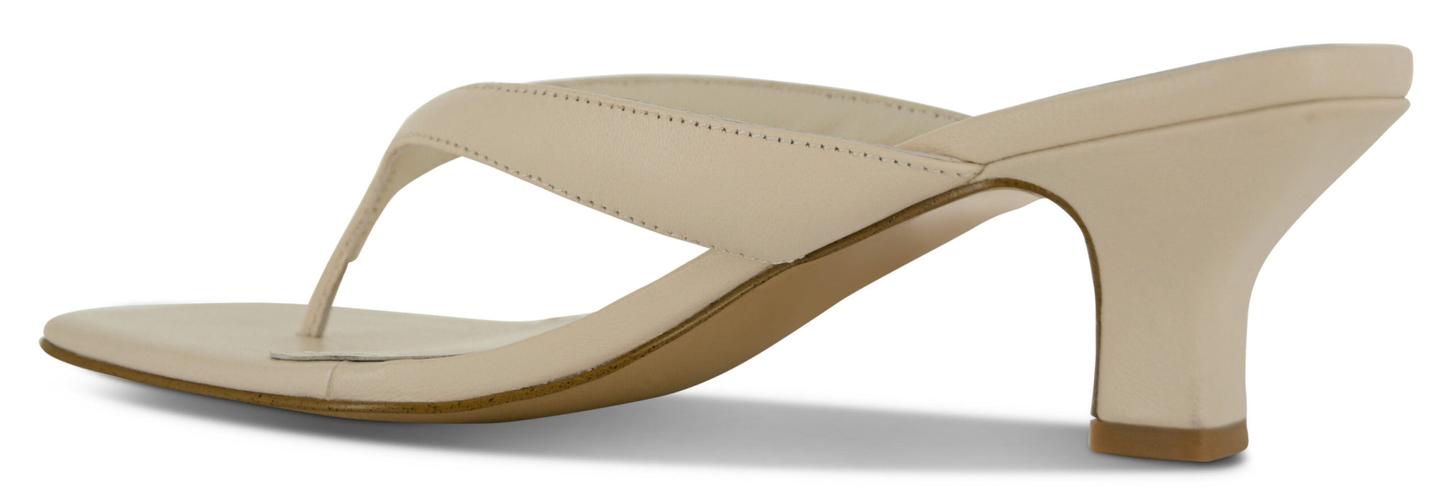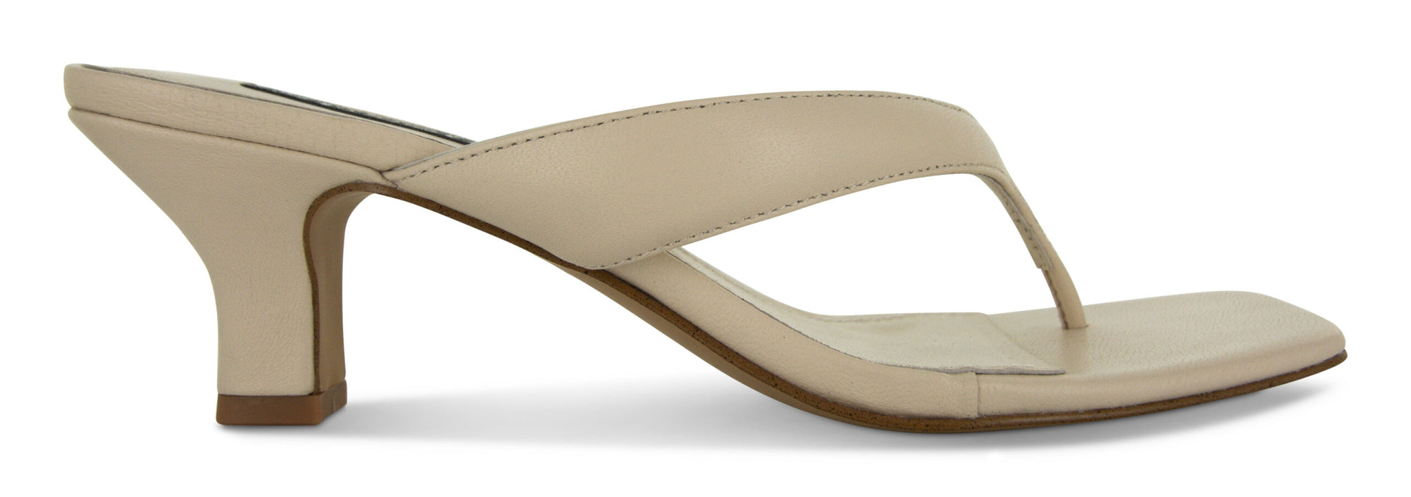 Chalk leather heeled mules in a thong style with a square toe.