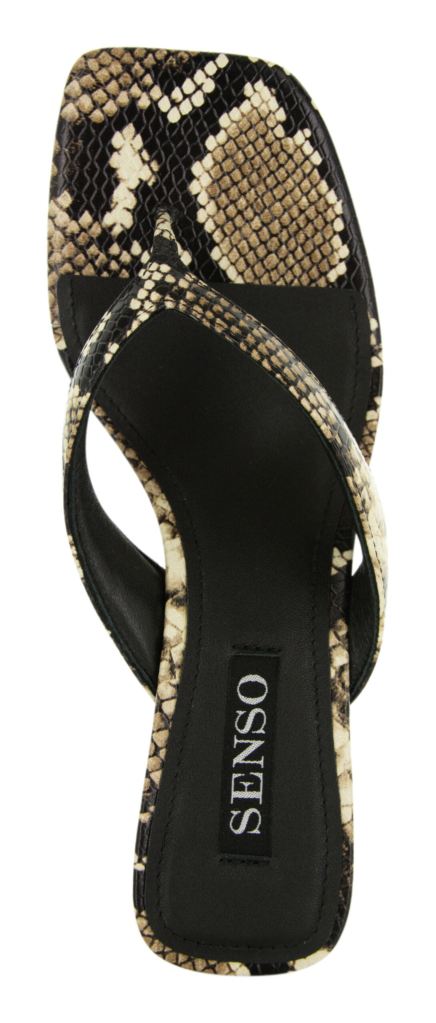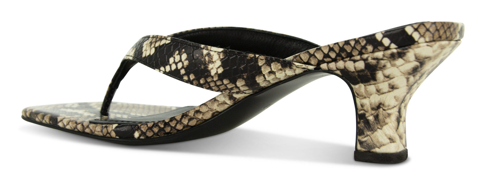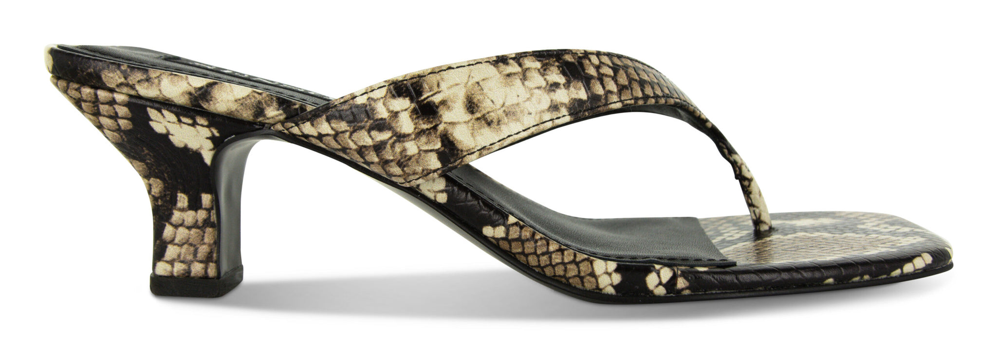 Snake printed leather heeled mules in a thong style with a square toe.