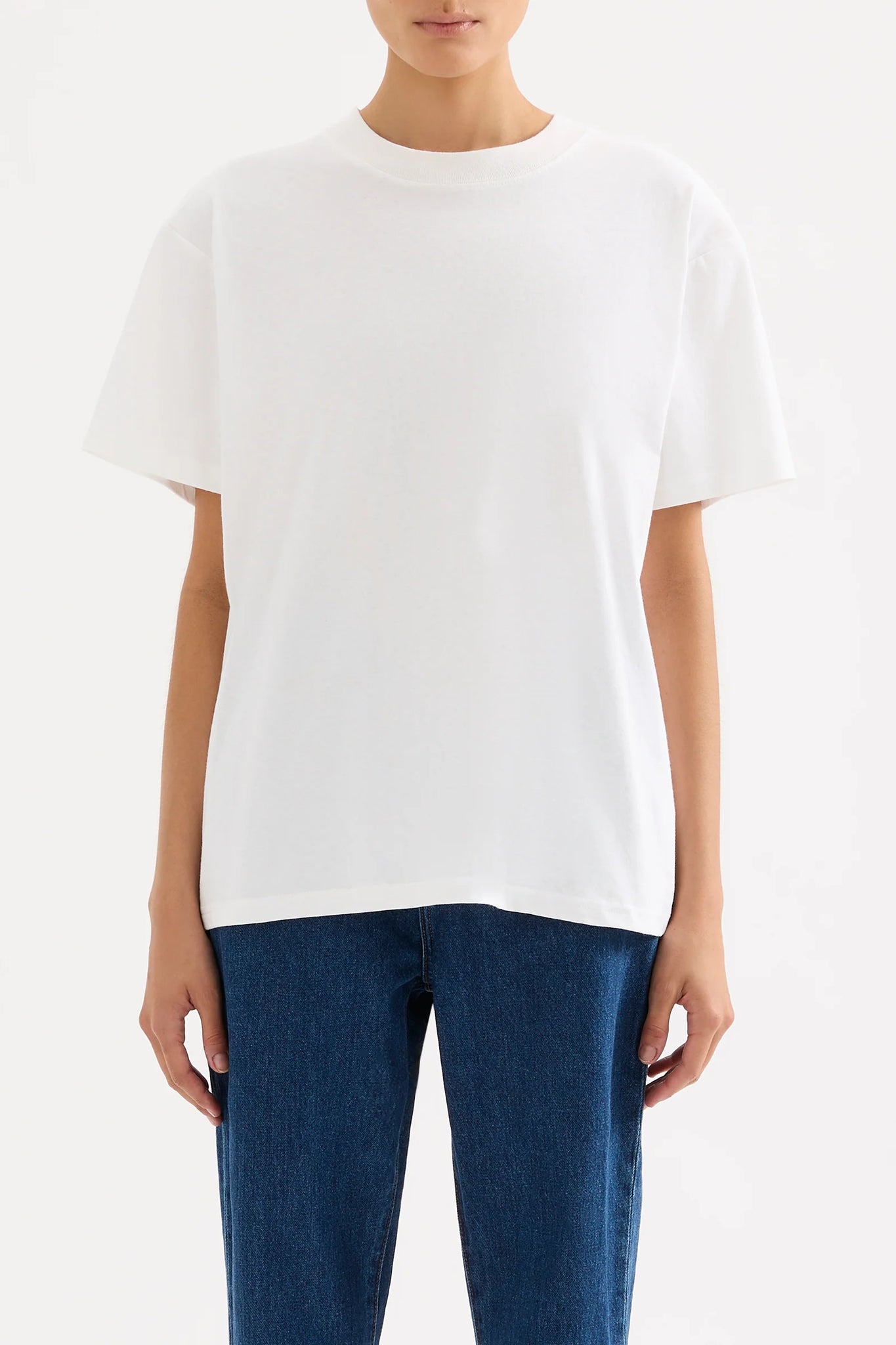 The Organic Stripe Boyfriend Tee is made from a heavyweight organic cotton jersey, which has been washed down for a breathable finish and soft hand feel. The silhouette is a larger boxy fit with length finishing just below the hips. Features include a crew neckline and short sleeves.