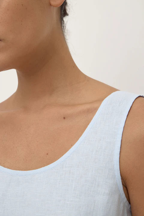 A-line scoop neck mini dress crafted from 100% linen. Offers a relaxed fit on the body.