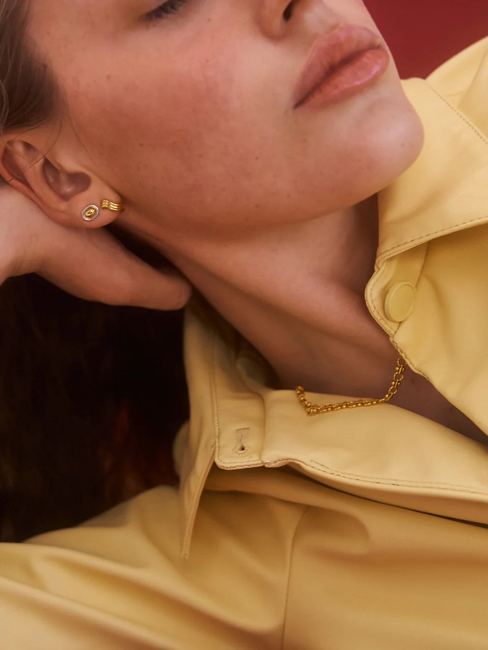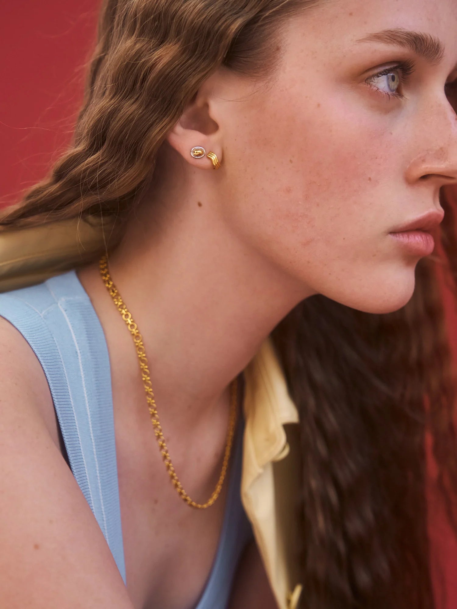 The Sidonie Necklace is a luxurious chain that combines elegance with unique detailing. Each link is accented with delicate studs, giving the chain a textured and dimensional look. This design allows the necklace to catch the light beautifully, adding a hint of shimmer. The Sidonie Necklace is versatile, making it perfect for both layering with other pieces or wearing as a statement on its own.