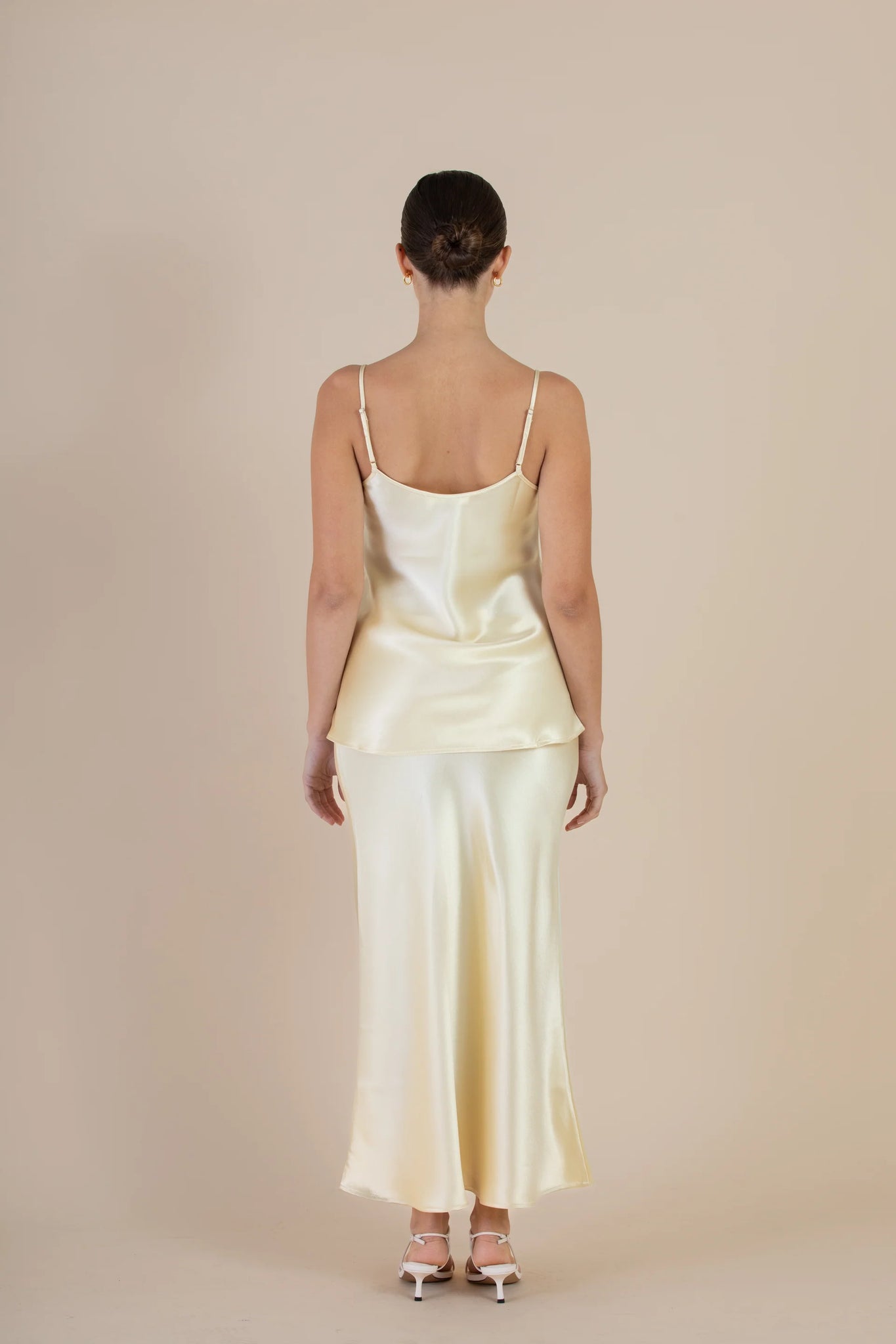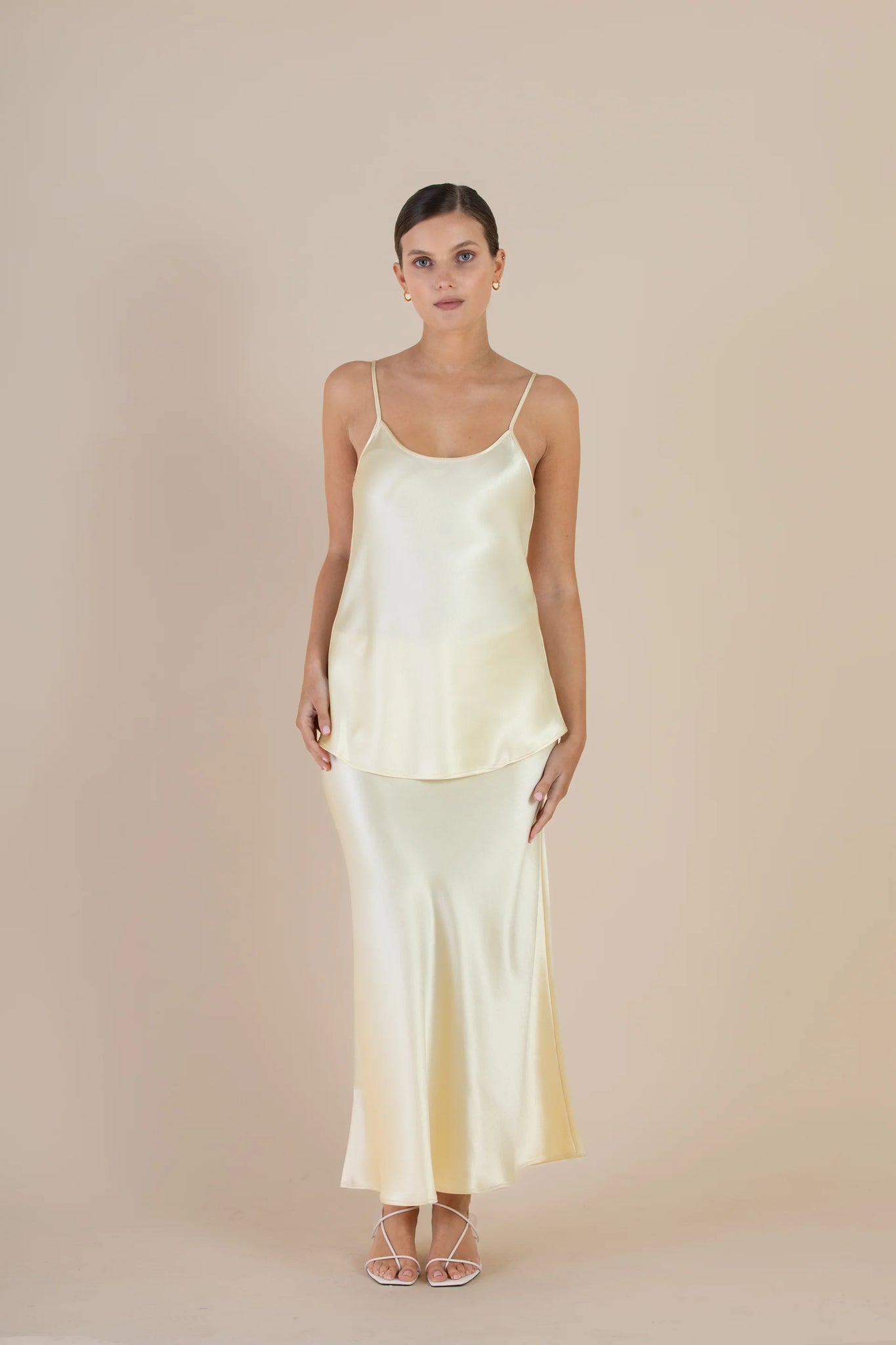 A timeless essential, The Audrey Skirt is cut on the bias from luxurious satin for a flawless drape that skims the body. Designed to sit high on the waist, this elegant midi-length silhouette moves effortlessly with you—equally refined with a structured blazer or a simple tank. A modern wardrobe classic, designed for effortless wear.
