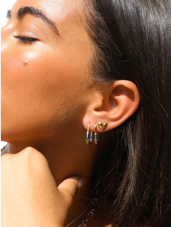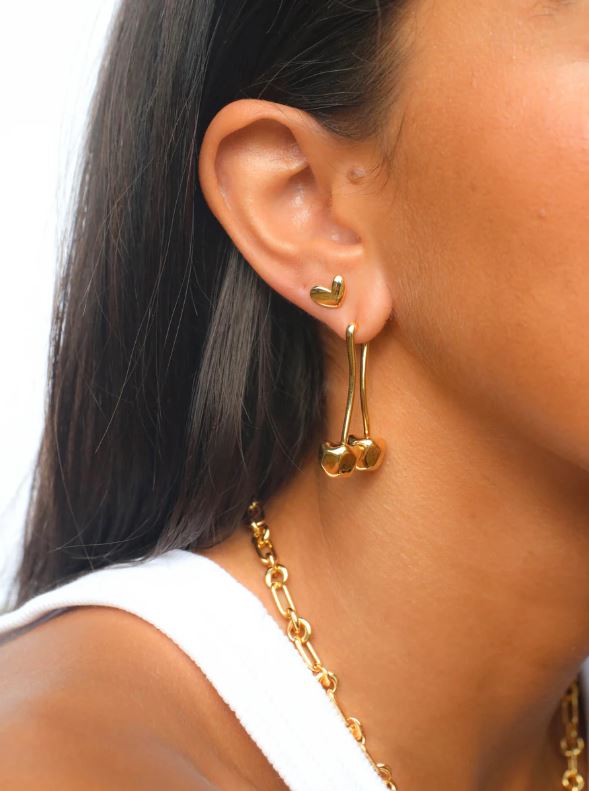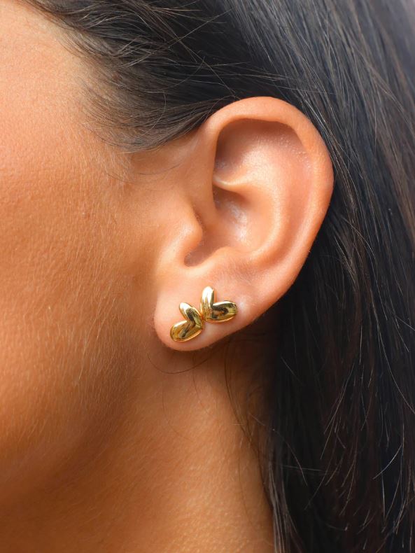 The Violet Stud Earrings Gold are sure to capture your heart. Featuring a tiny pair of solid asymmetric hearts with butterfly fastenings. Wear alone or add to your ear stack.