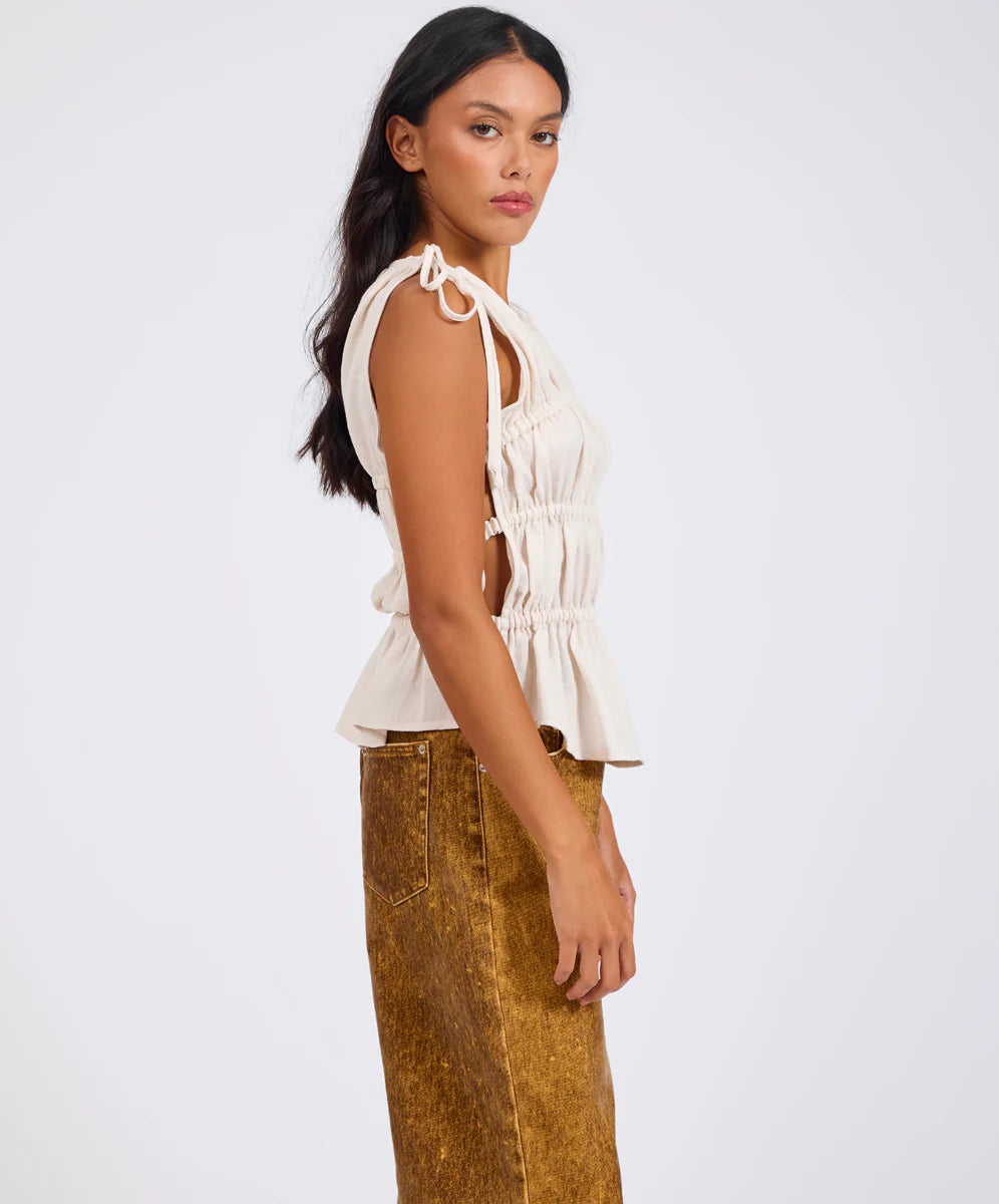 The CREAM EVELYN GATHERED RUCHED TIE TOP combines softness and structure with feminine edge. Elasticated ruching and tie-shoulder straps create sculpted texture.