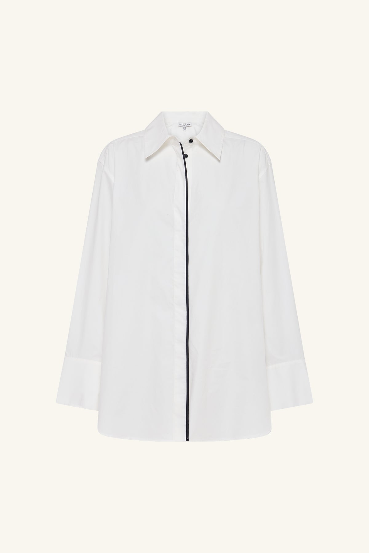 Long sleeve shirt in a white organic cotton poplin with black contrast binding.
