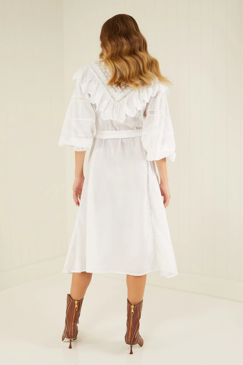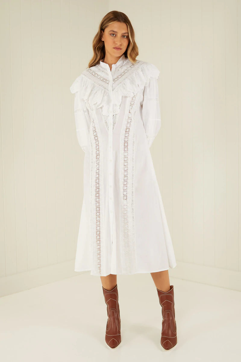 The Stella Dress printed in classic White hue is crafted from 100% premium Cotton & features Lace detail throughout. With Blouson sleeves, elasticated cuffs, button down detailing and a free flowing drop hem. Dress up or down with ease, a truly timeless wardrobe addition.